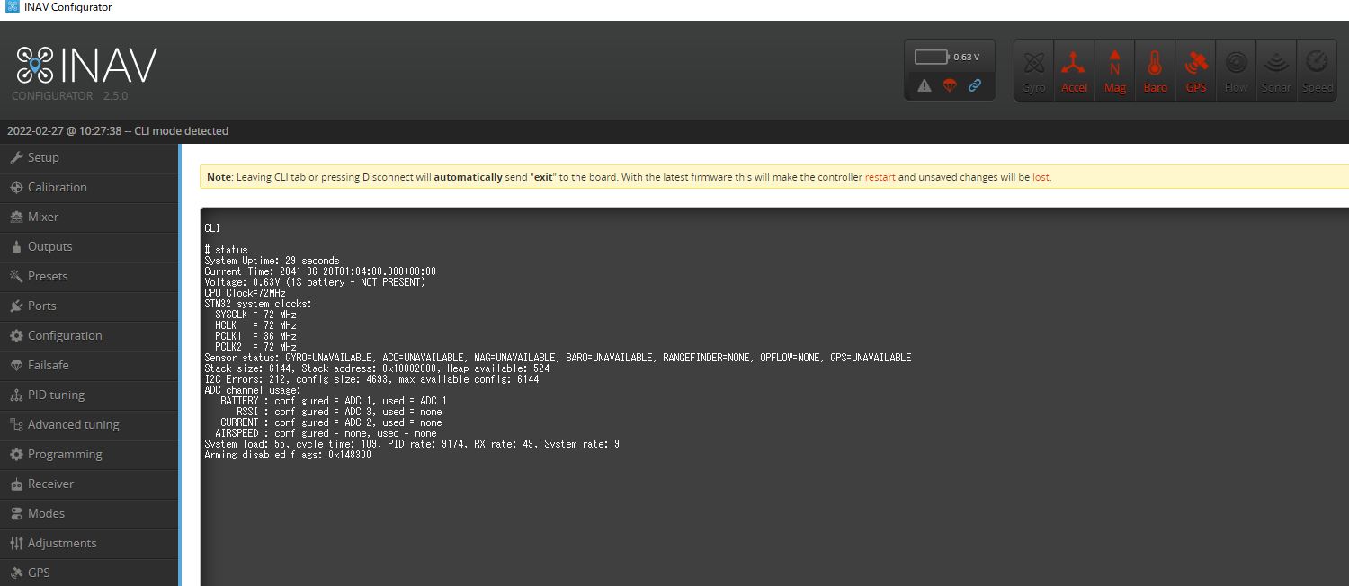 INAVソフトでジャイロが認識せず、他のセンサーも赤になってまともに動作していません。