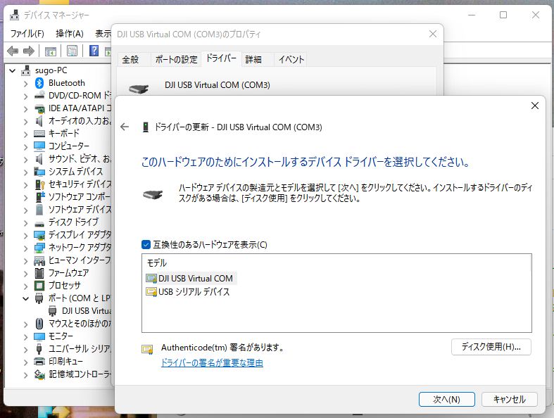 過去のブログ記事を参考にして、DJIのデバイスドライバーをインストールして、ドライバーの更新からコンピューター内からインストールするデバイスドライバーを選択する画面でDJI USB Virtual COMを選択すると接続可能になりました。