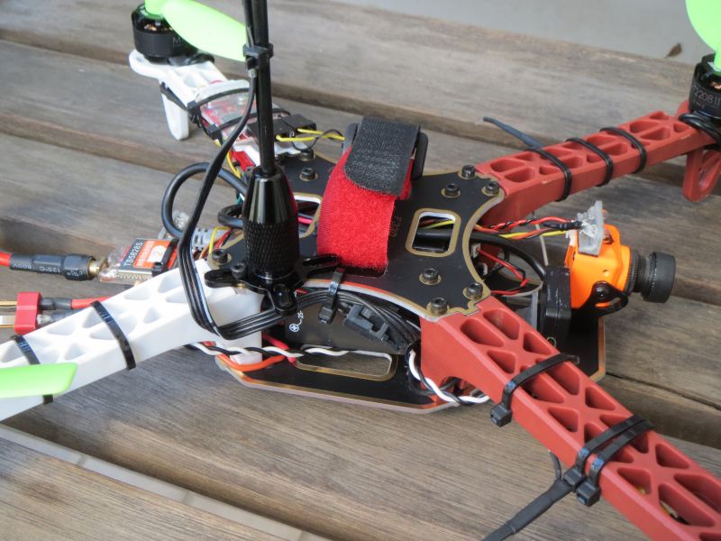 左後ろアームにNAZA OSDを付けて、前にRuncam Swift Miniカメラ、後ろにVTXを取り付けました。